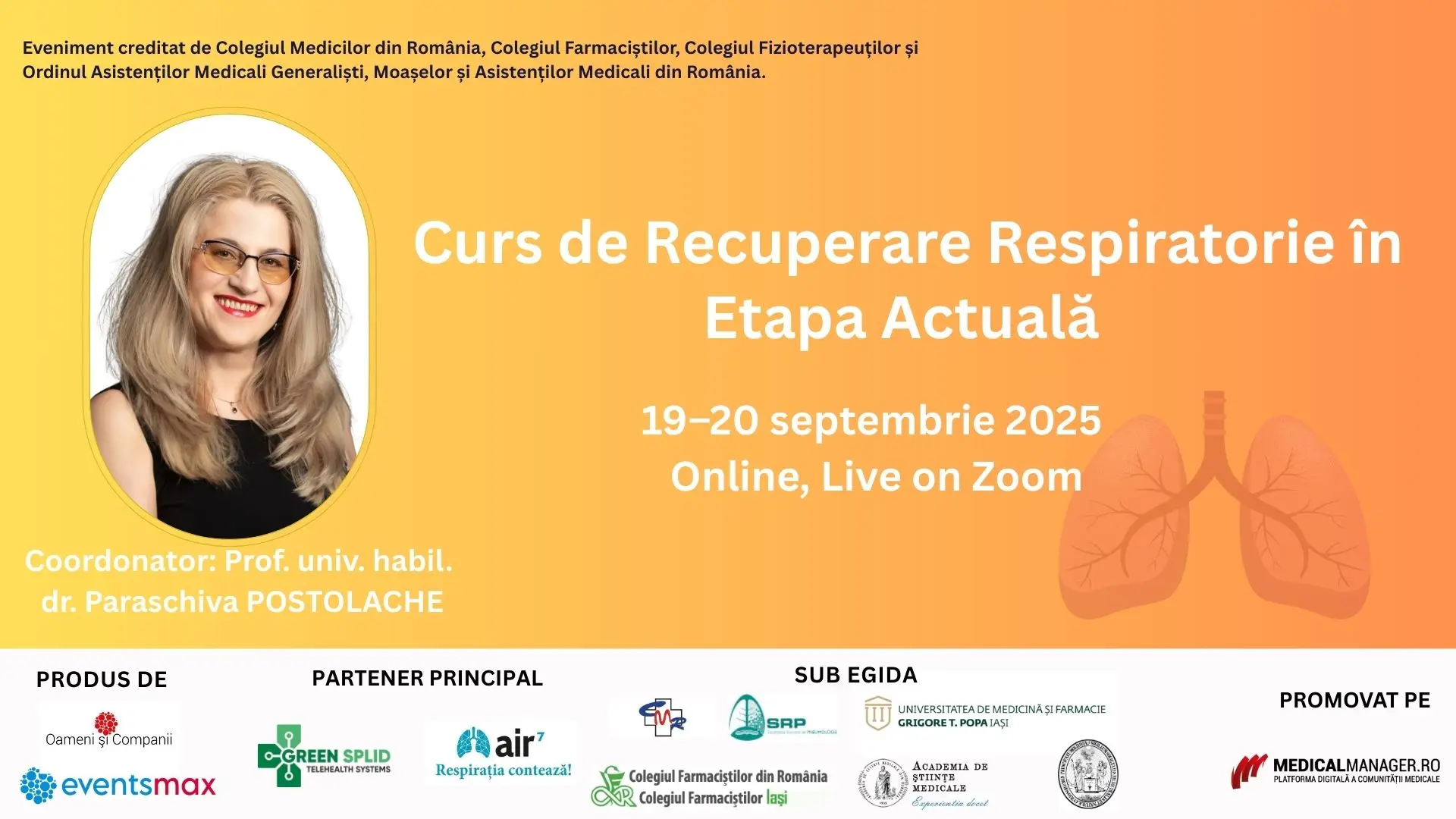 În perioada 19 – 20 septembrie 2025 va avea loc, pe platforma ZOOM, Cursul de Recuperare Respiratorie în Etapa Actuală, un eveniment dedicat aprofundării celor mai noi tehnici