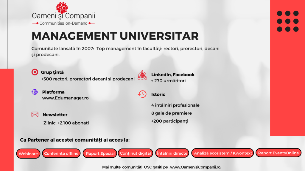 Comunitatea include top management în universități și facultăți: rectori, prorectori, directori generali, decani și pro-decani. Oameni și Companii derulează, din 2007, un program de comunicare profesională pentru această comunitate: Management Modern în Educație. 12 întâlniri profesionale au fost organizate în cadrul programului. O platformă digitală este dedicată comunității: edumanager.ro.