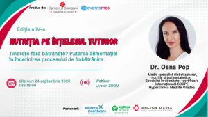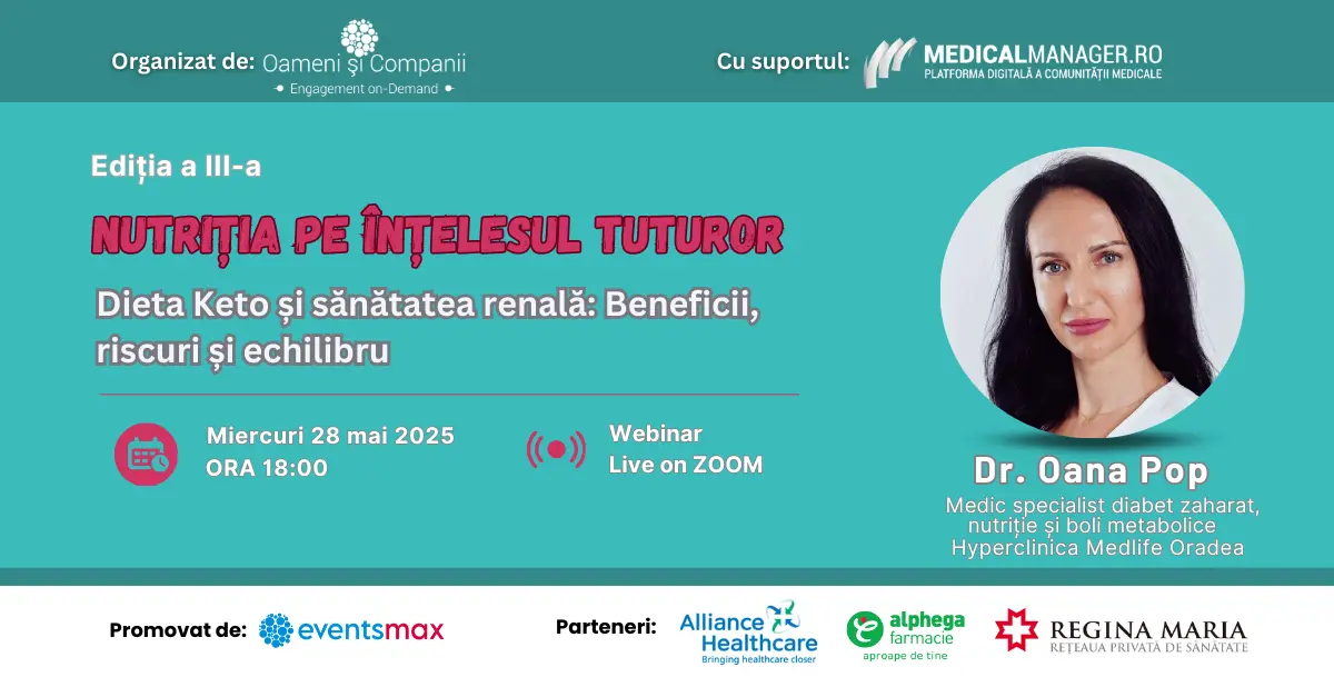 “În cadrul acestui webinar, vom analiza în detaliu ce presupune dieta Keto, cum funcționează metabolic și ce efecte poate avea asupra sistemului renal. Vom discuta atât beneficiile demonstrate științific, cât și riscurile mai puțin cunoscute, inclusiv în contextul unor afecțiuni preexistente. Este important să înțelegem că o dietă eficientă nu este automat și una sigură pentru toată lumea. Vom explora semnele de alarmă care nu trebuie ignorate, dar și cum se poate adapta alimentația pentru a menține echilibrul dintre rezultate și sănătate. Dacă v-ați întrebat vreodată dacă dieta Keto vi se potrivește sau cum puteți urma această dietă în siguranță, acest webinar este util. Vă invit să participați și să descoperim împreună ce înseamnă, de fapt, o alimentație sănătoasă pentru minte, corp și rinichi”, subliniază Dr. Oana Pop.